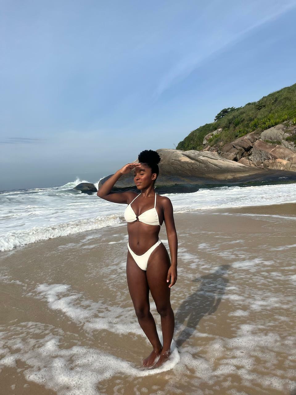 Top com argola em resina na cor preta no meio do busto, amarração nas costas e pescoço.